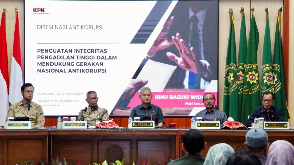 Rabu, 10 Desember 2025 memenuhi undangan dari Ketua Pengadilan Tinggi Yogyakarta Nomor : 1357/KPT.W13-U/UND.HM2.1.1/XII/2025 Ketua Pengadilan Negeri Sleman Ibu Wari Juniati, S.H., M.H bersama Wakil Ketua, para Hakim, Panitera, Sekretaris, dan Pejabat Pengadaan pada Pengadilan Negeri Sleman menghadiri acara Diseminasi Anti Korupsi yang diselenggarakan oleh Komisi Pemberantasan Korupsi Republik Indonesia dan Pengadilan Tinggi Yogyakarta yang bertempat di Ruang Sidang Utama Pengadilan Tinggi Yogyakarta. Acara dibuka oleh YM Ketua Pengadilan Tinggi Yogyakarta Bapak Prof.Dr. Herri Swantoro,S.H.,M.H dan hadir sebagai narasumber dalam acara tersebut Wakil Ketua KPK RI Bapak Ibnu Basuki Widodo.