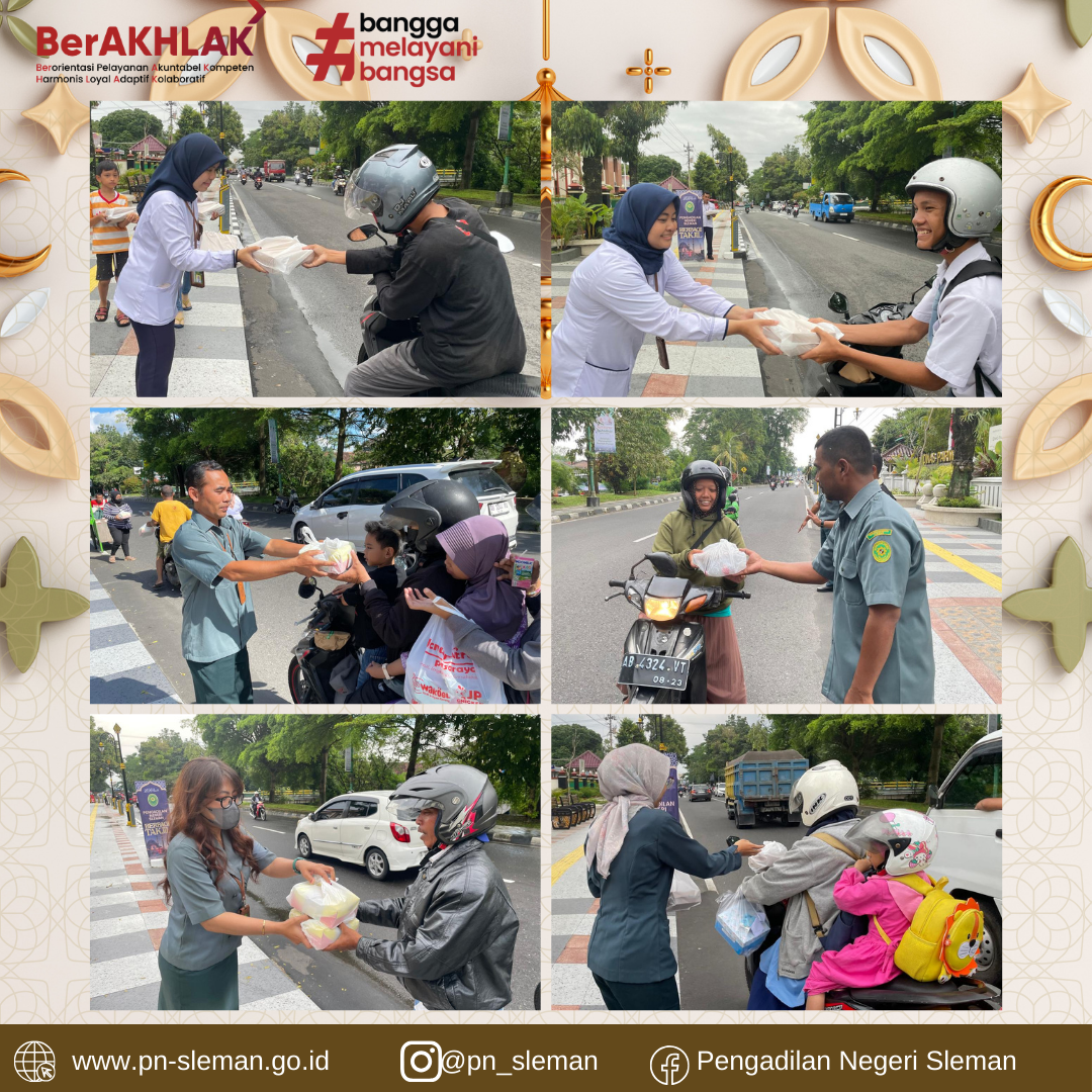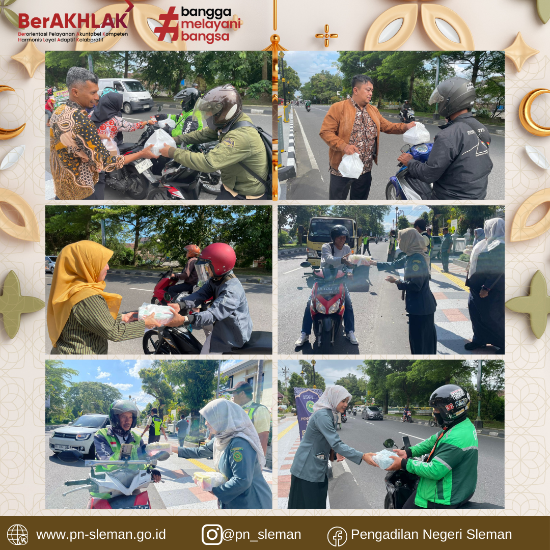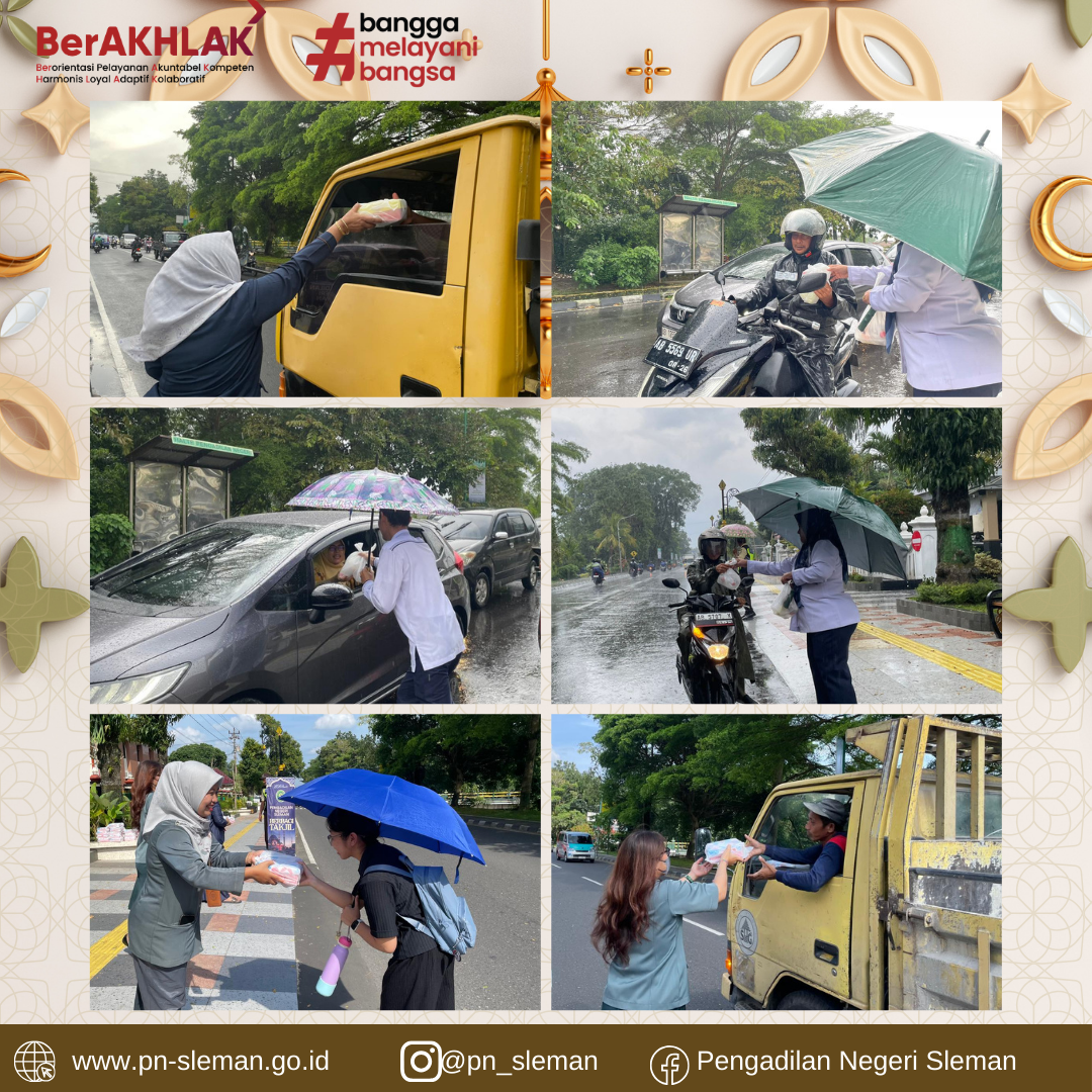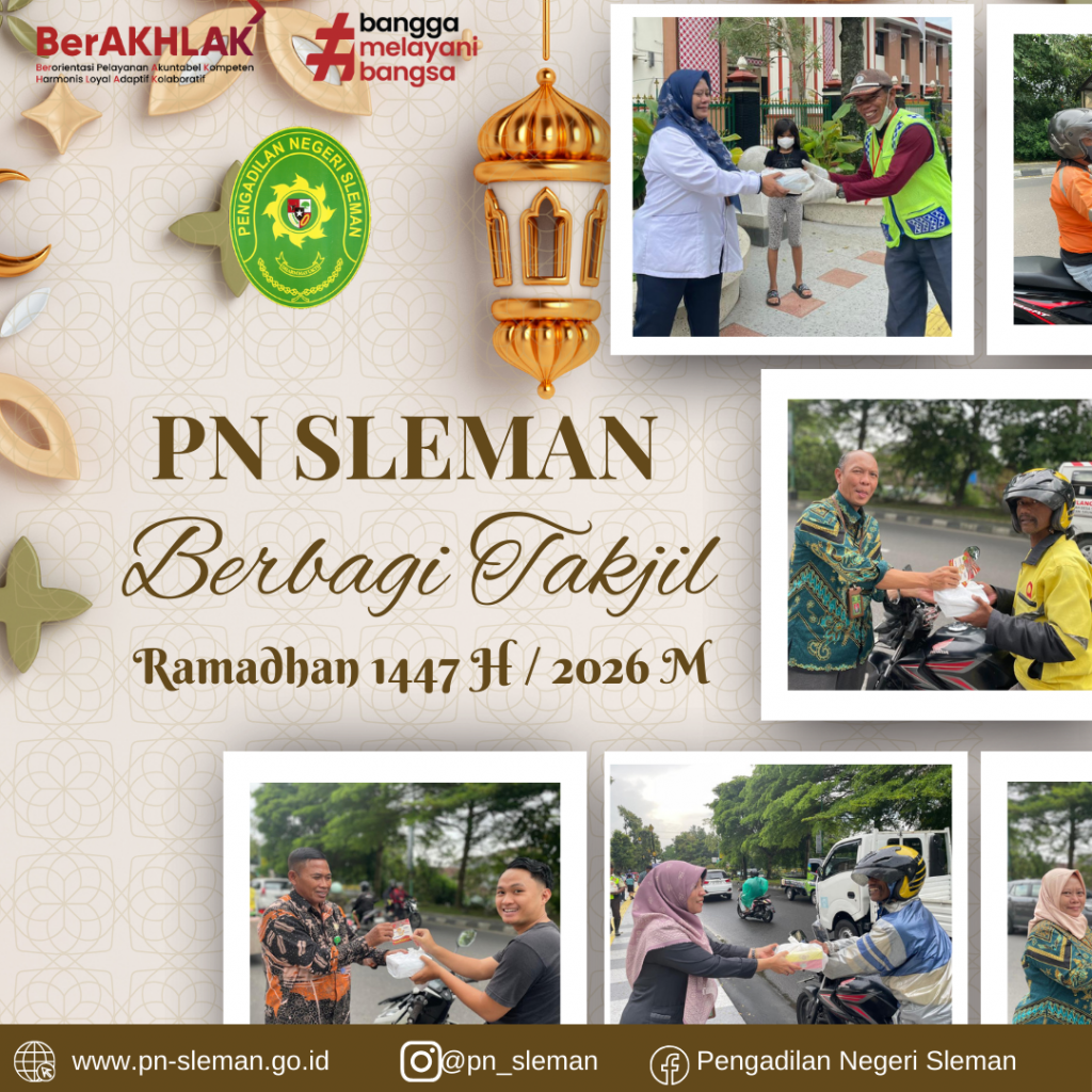Salah Satu Kegiatan yang dilaksanakan Pengadilan Negeri Sleman pada bulan suci Ramadhan tahun 1446 H/ 2026 M ini adalah PN Sleman Berbagi Takjil. Kegiatan ini merupakan wujud kepedulian antar sesama yang diberikan Pengadilan Negeri Sleman kepada para masyarakat, terutama bagi kaum muslim yang sedang menjalankan ibadah puasa.