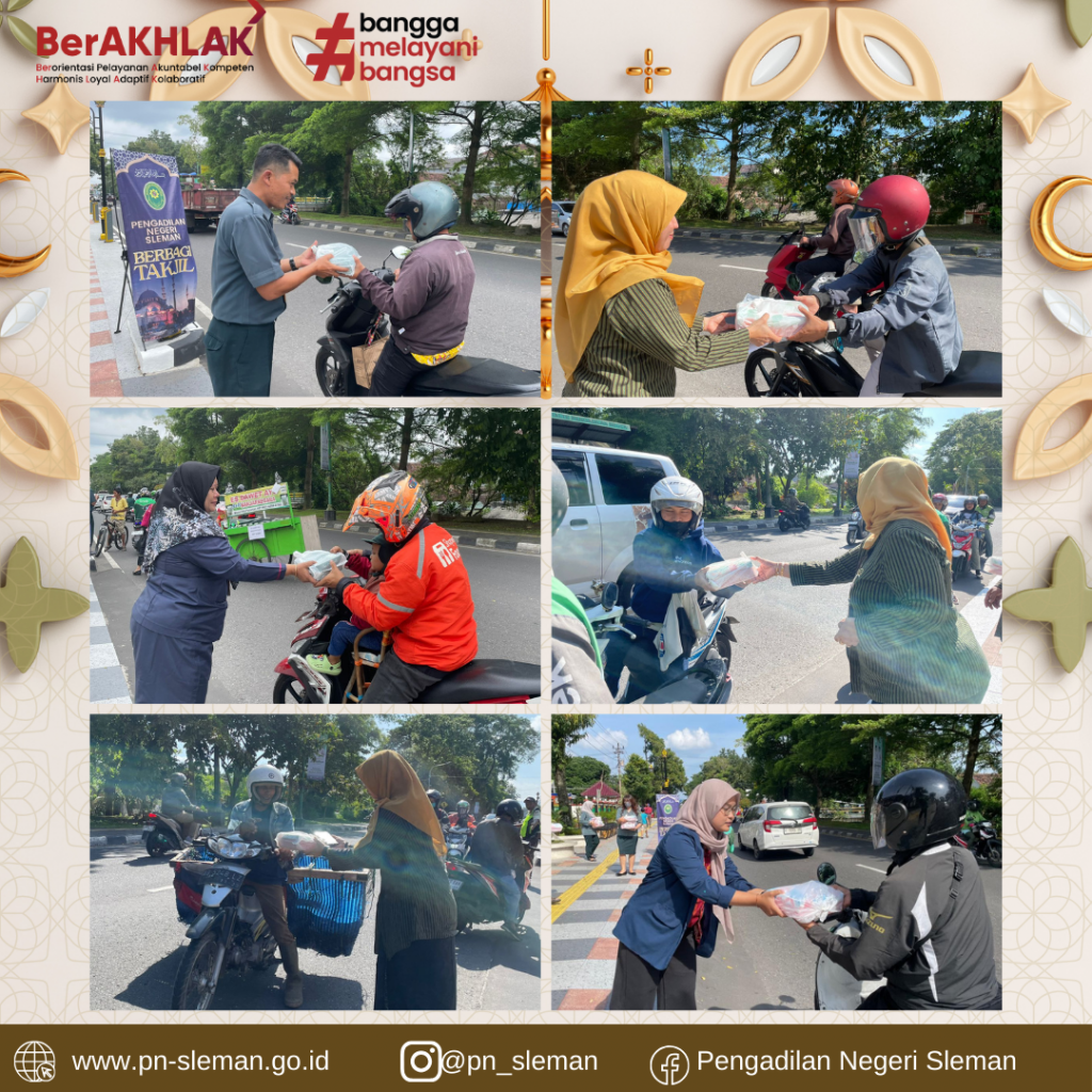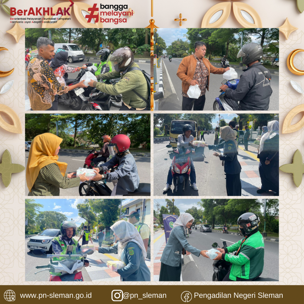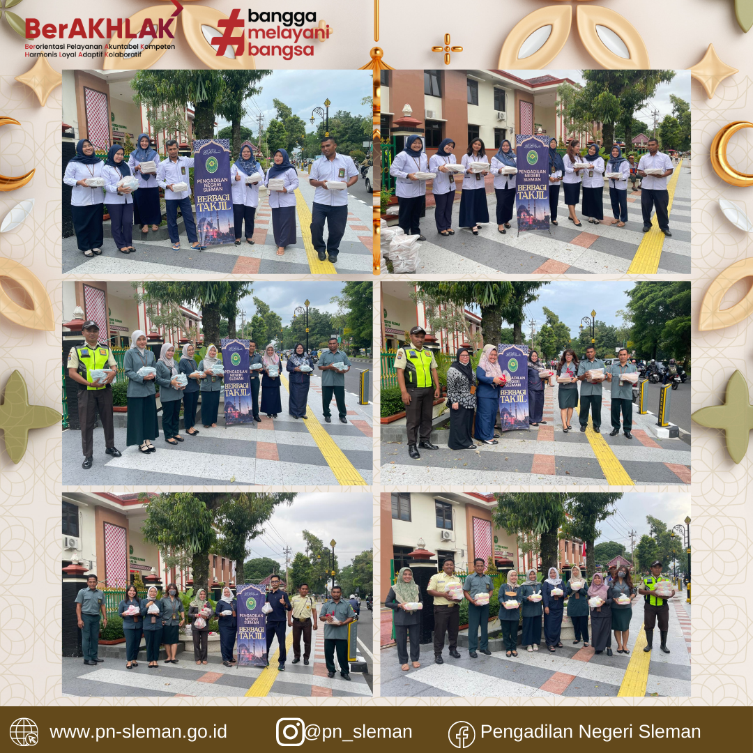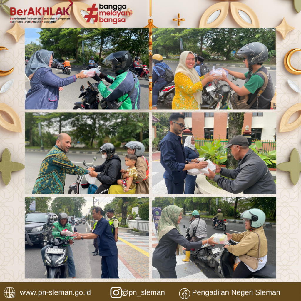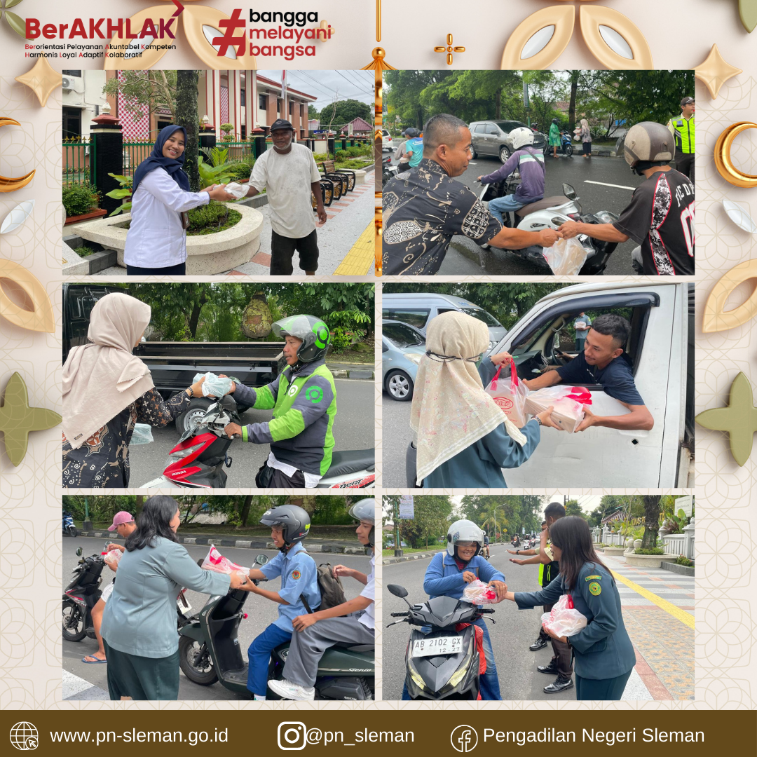Salah Satu Kegiatan yang dilaksanakan Pengadilan Negeri Sleman pada bulan suci Ramadhan tahun 1446 H/ 2026 M ini adalah PN Sleman Berbagi Takjil. Kegiatan ini merupakan wujud kepedulian antar sesama yang diberikan Pengadilan Negeri Sleman kepada para masyarakat, terutama bagi kaum muslim yang sedang menjalankan ibadah puasa.