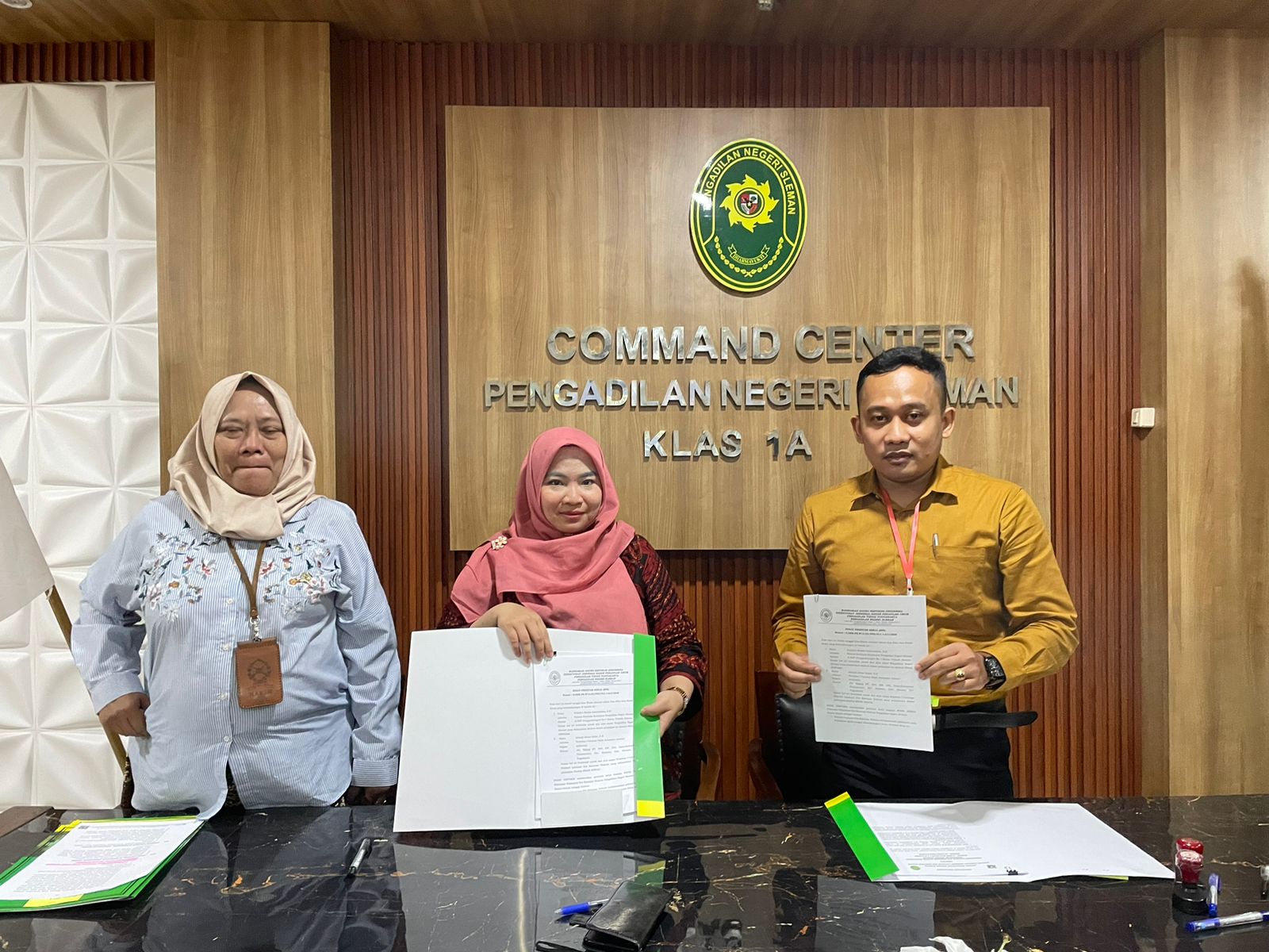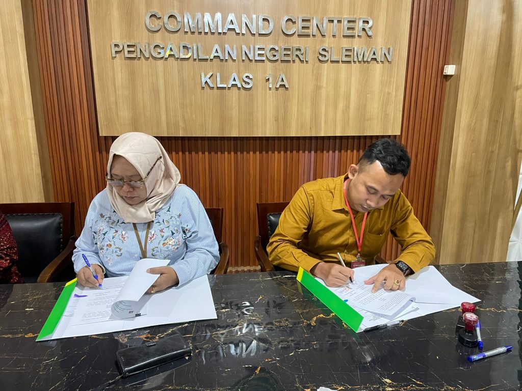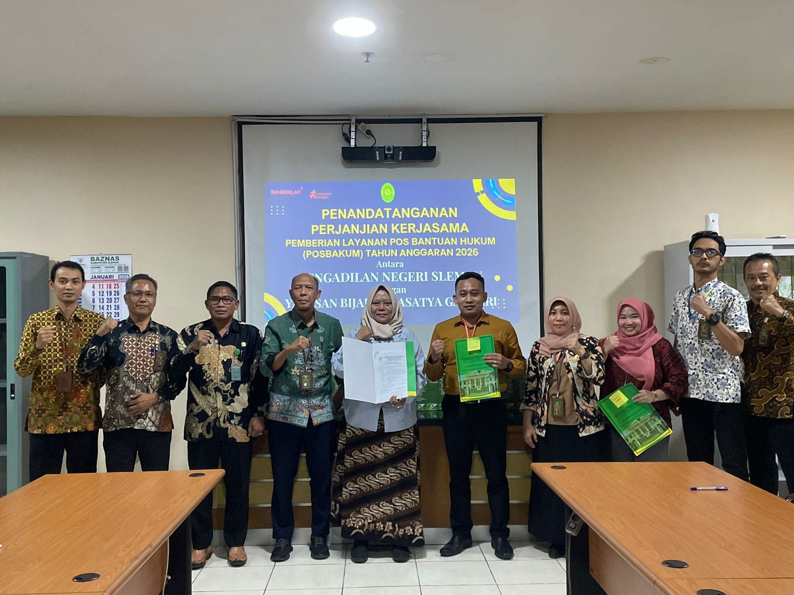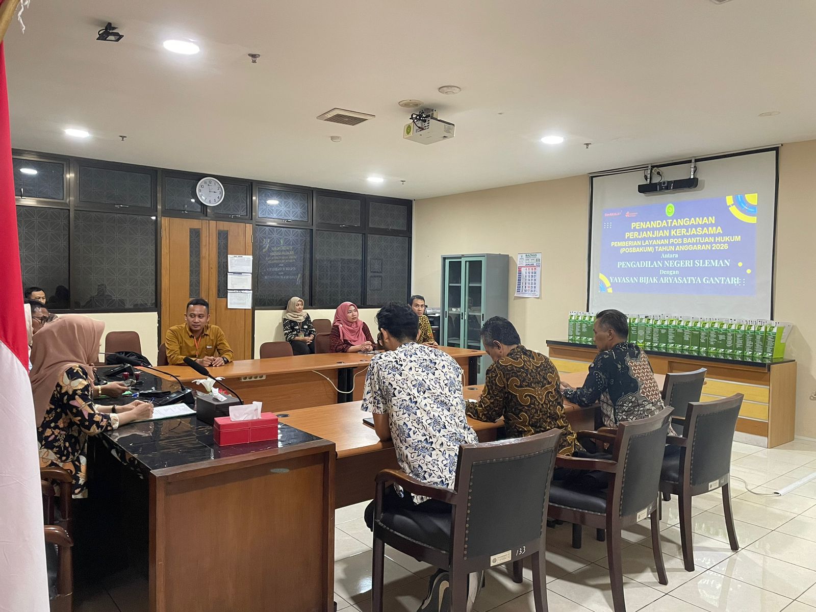 Pengadilan Negeri Sleman melaksanakan kegiatan Penandatanganan Perjanjian Kerjasama dan Kontrak Jasa Layanan Pos Bantuan Hukum/ Posbakum antara Pengadilan Negeri Sleman dengan Yayasan Bijak Aryasatya Gantari Tahun Anggaran 2026. Hadir dalam kesempatan tersebut Ketua Pengadilan Negeri Sleman didampingi Panitera, Sekretaris dan Pejabat Struktural Pengadilan Negeri Sleman. Perjanjian Kerjasama ditandatangani oleh Ketua Pengadilan Negeri Sleman dengan dengan Perwakilan Yayasan Bijak Aryasatya Gantari, dan Penandatanganan Kontrak Kerja oleh Pejabat Pembuatan Komitmen (PPK) dengan Perwakilan Yayasan Bijak Aryasatya Gantari. Diharapkan pelayanan Posbakum pada Pengadlian Negeri Sleman dapat meningkat dalam pemberian layanan hukum bagi masyarakat pencari keadilan di Kabupaten Sleman.