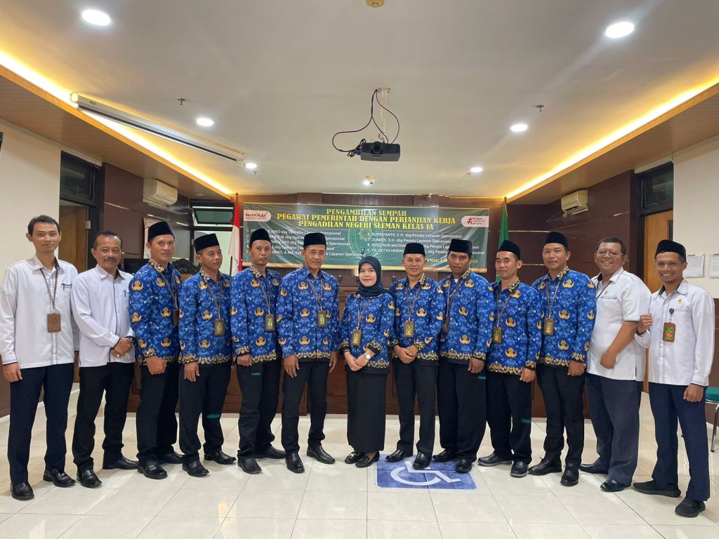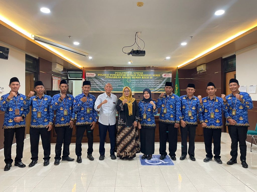 Senin, 1 September 2025 bertempat di Ruang Sidang Utama Pengadilan Negeri Sleman, dilangsungkan acara Pengambilan Sumpah/Janji 9 (sembilan) Pegawai Pemerintah dengan Perjanjian Kerja (PPPK) pada Pengadilan Negeri Sleman Kelas IA. Acara pengambilan sumpah/janji dipimpin langsung oleh Ketua Pengadilan Negeri Sleman Ibu Wari Juniati, S.H., M.H.