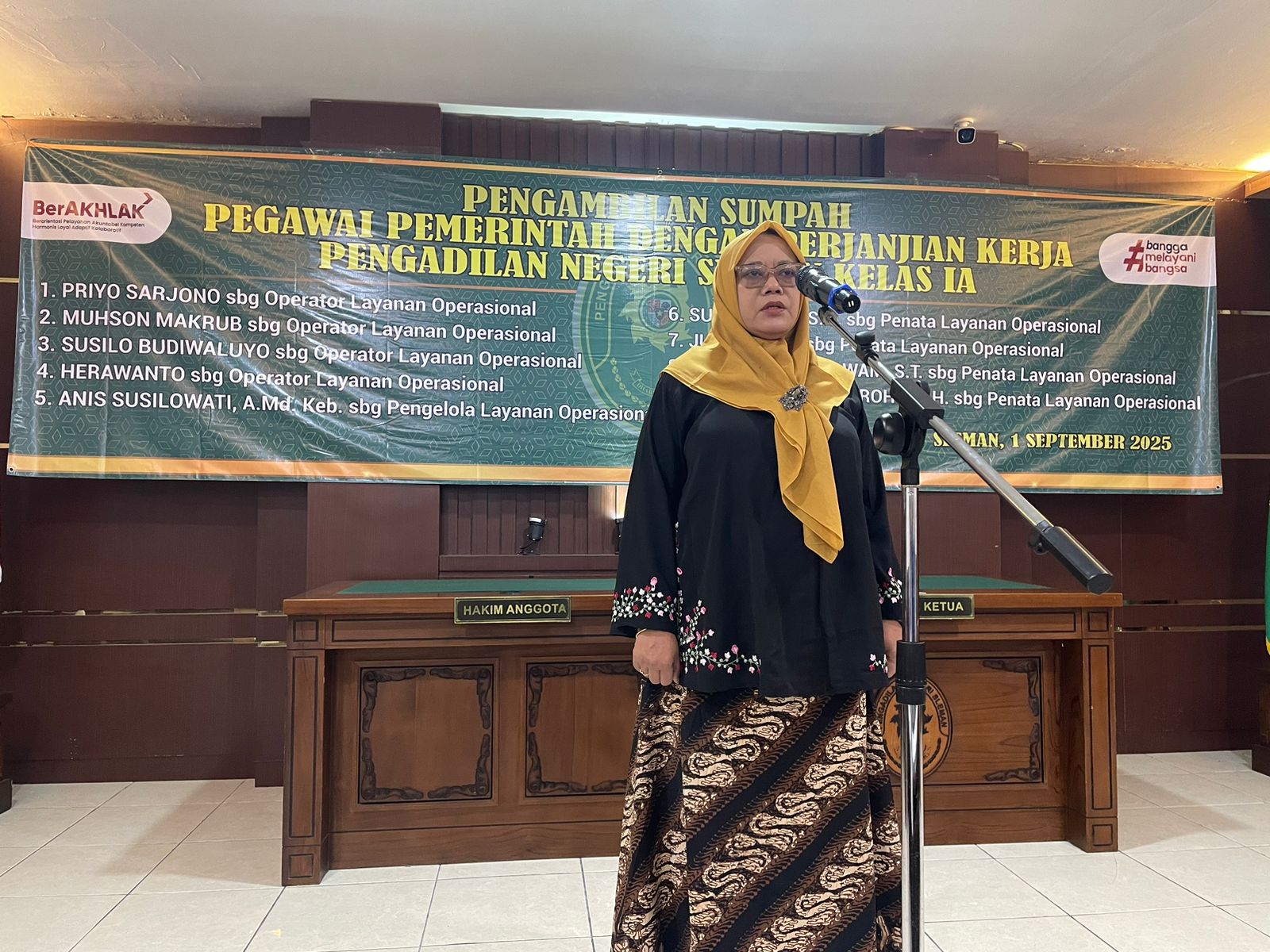 Senin, 1 September 2025 bertempat di Ruang Sidang Utama Pengadilan Negeri Sleman, dilangsungkan acara Pengambilan Sumpah/Janji 9 (sembilan) Pegawai Pemerintah dengan Perjanjian Kerja (PPPK) pada Pengadilan Negeri Sleman Kelas IA. Acara pengambilan sumpah/janji dipimpin langsung oleh Ketua Pengadilan Negeri Sleman Ibu Wari Juniati, S.H., M.H.