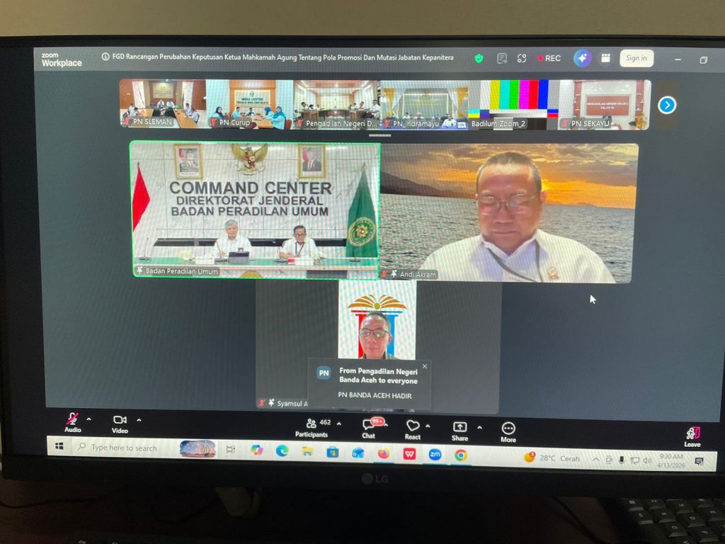 Senin, 13 April 2026 bertempat di Ruang Command Center, memenuhi Surat dari Badan Strajak, Diklat Hukum Dan Peradilan Nomor 431/BSDK/UND.HM2.1.1/IV/2026, Wakil Ketua Pengadilan Negeri Sleman Bapak Agung Nugroho,S.H.,M.H didampingi Panitera, perwakilan Panitera Muda, Panitera Pengganti, dan Jurusita mengikuti acara Focus Group Discussion (FGD) Penyusunan Naskah Urgensi Tahun Anggaran 2026 dengan judul “Rancangan Perubahan Keputusan Ketua Mahkamah Agung Tentang Pola Promosi Dan Mutasi Jabatan Kepaniteraan Pada Badan Peradilan Yang Berada Dibawah Mahkamah Agung” secara daring melalui zoom meeting.