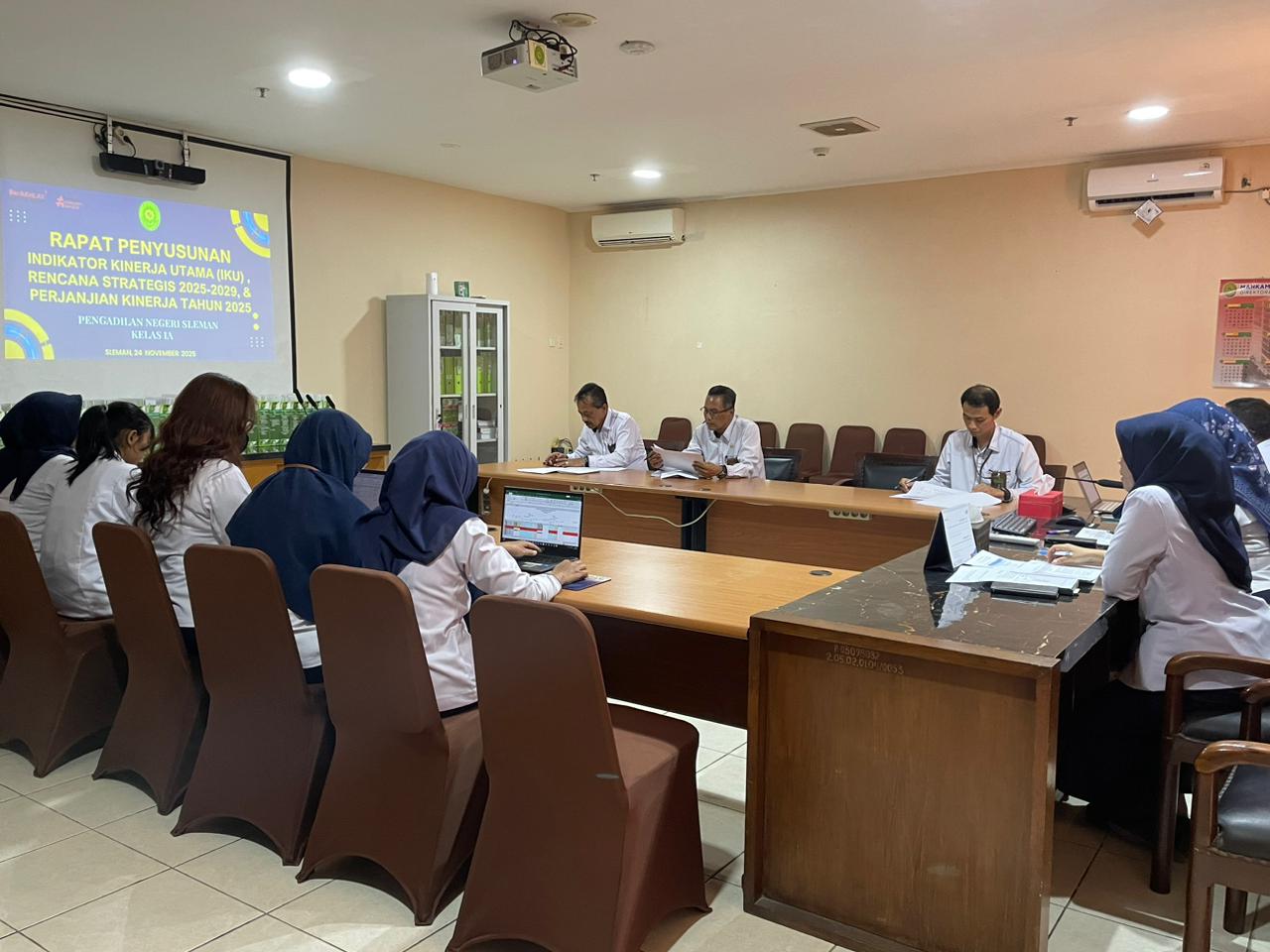Senin, 24 November 2025 bertempat di Ruang Command Center, Pengadilan Negeri Sleman melaksanakan Rapat Penyusunan Indikator Kinerja Utama, Rencana Strategis 2025-2029 dan Perjanjian Kinerja Tahunan Tahun 2025. Rapat tersebut dipimpin langsung oleh Ketua Pengadilan Negeri Sleman Ibu Wari Juniati,S.H.,M.H didampingi Panitera, Sekretaris, Para Pejabat Struktural dan perwakilan dari masing-masing Kepaniteraan dan Sub.Bagian. Rapat ini dilaksanakan dalam rangka menindaklanjuti Surat Keputusan Sekretaris Mahkamah Agung RI No 27101/SEK/SK.RA1.3/X/2025 tentang Penetapan Indikator Kinerja Utama Pengadilan Tk Banding dan Pengadilan Tk Pertama di Lingkungan Mahkamah Agung RI Tahun 2025-2029. Dalam rapat tersebut dibahas pula terkait target Perjanjian Kinerja 2025 yang disesuaikan dengan Indikator Kinerja Utama yang baru dengan melibatkan unsur pimpinan pada Pengadilan Negeri Sleman.