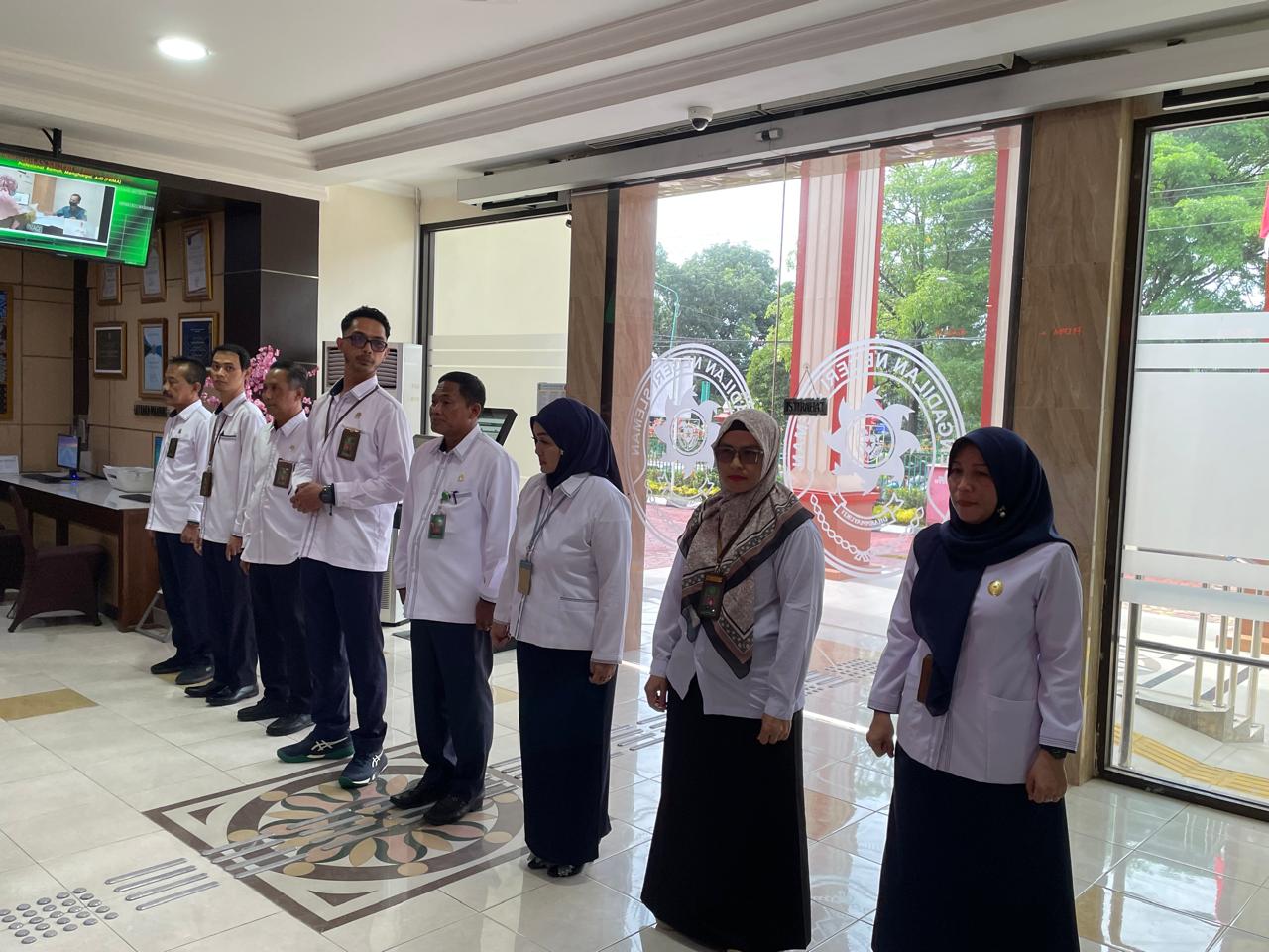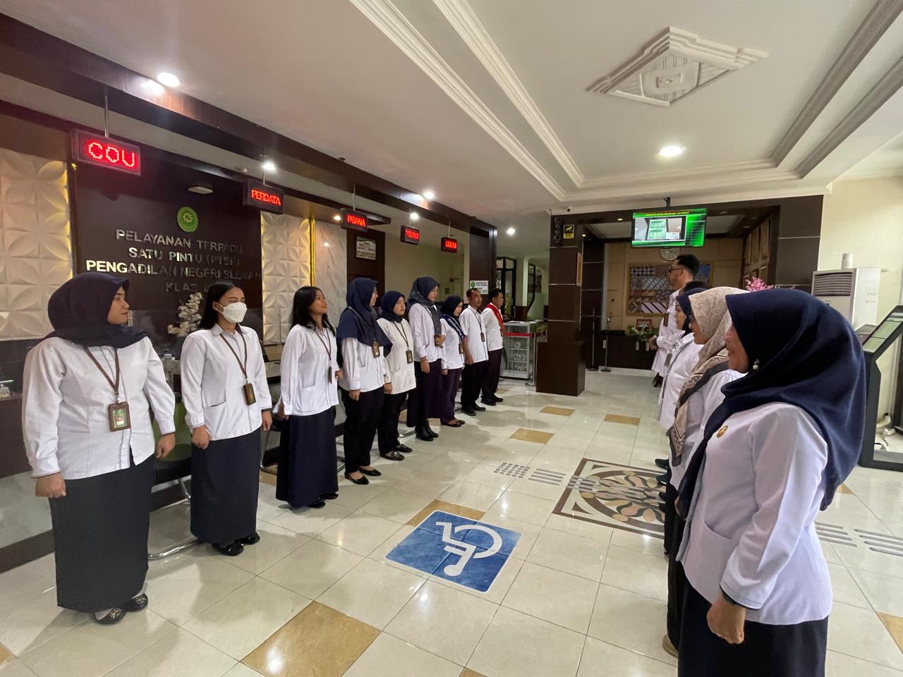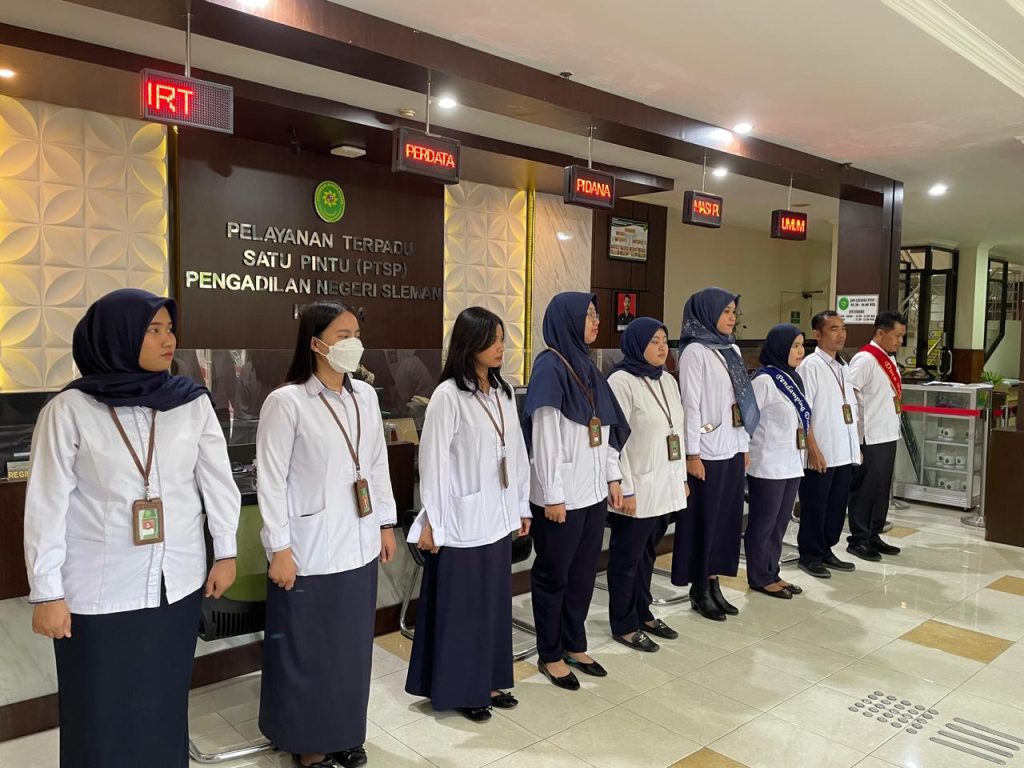 Senin, 24 November 2025 dilaksanakan Briefing Pagi petugas PTSP Pengadilan Negeri Sleman dihadiri oleh Hakim Pengawas PTSP, Panitera, Sekretaris dan Para Pejabat Struktural. Kegiatan ini dilaksanakan untuk melakukan koordinasi, monitoring evaluasi pelaksanaan pelayanan di PTSP, dan untuk selalu mengingatkan kepada para petugas PTSP agar selalu memberikan pelayanan yang terbaik bagi para tamu PTSP, tidak menerima imbalan berupa apapun, serta selalu menerapkan 5S (Senyum, Sapa, Salam,Sopan,Santun).