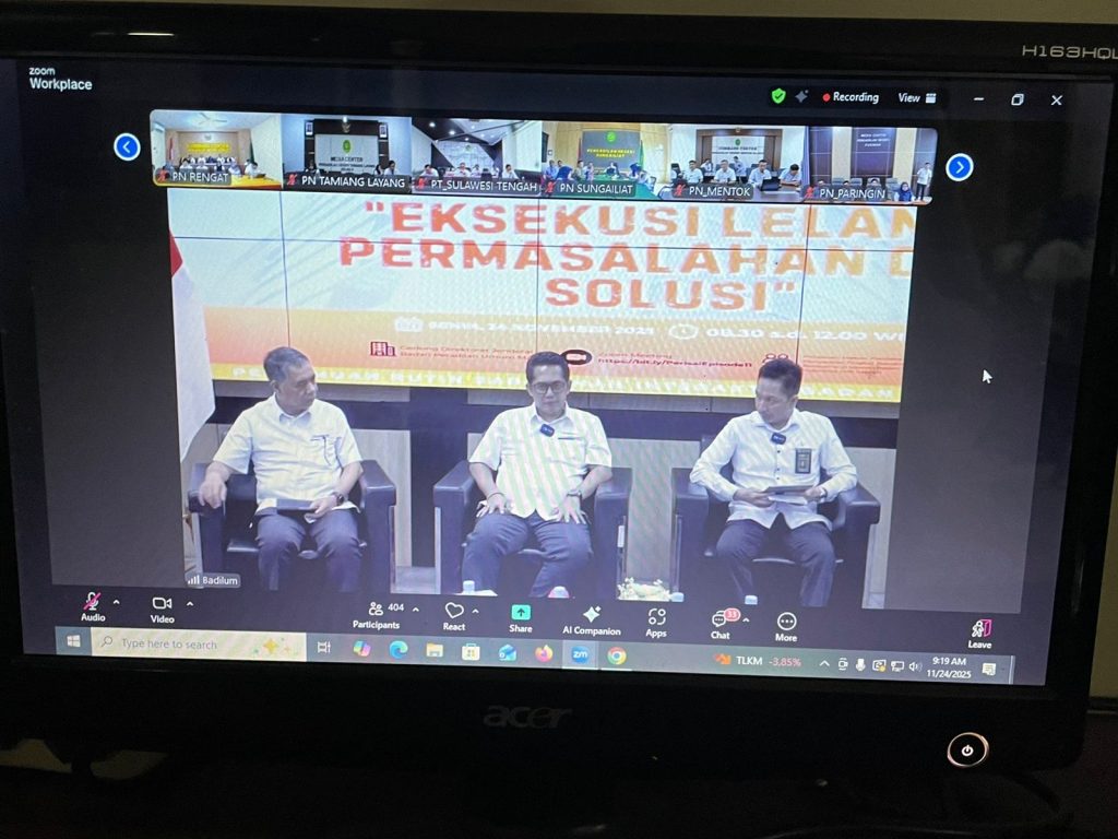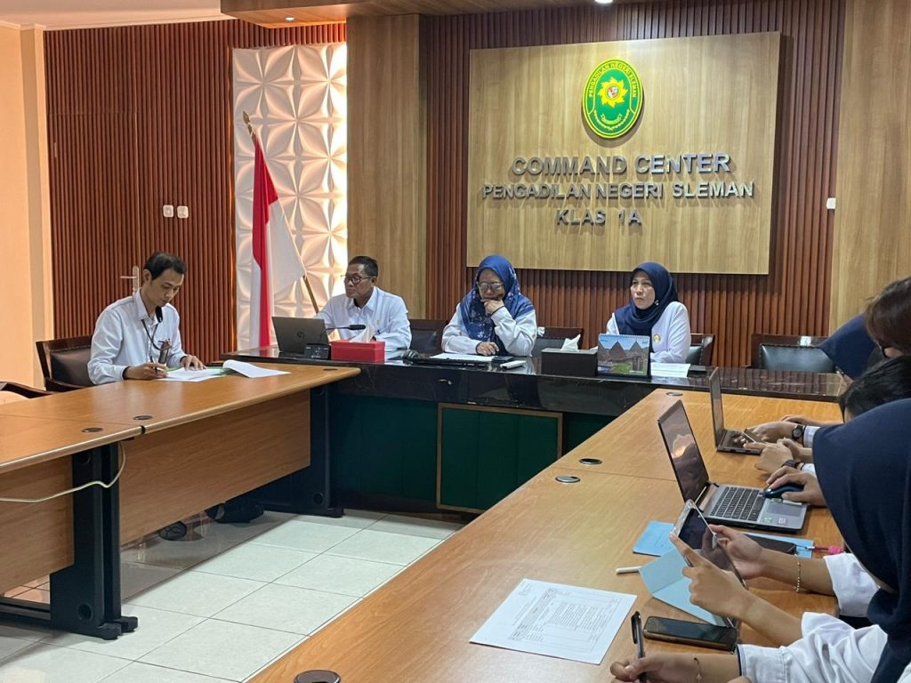 Senin, 24 November 2025 bertempat di Ruang Command Center, memenuhi Surat dari Direktur Jenderal Badan Peradilan Umum Nomor 313/DJU/UND.DL1.10/XI/2025, Ketua Pengadilan Negeri Sleman Ibu Wari Juniati,S.H.,M.H didampingi Wakil Ketua, dan para Hakim Pengadilan Negeri Sleman menghadiri acara Pertemuan Rutin dan Sarasehan Interaktif Badan Peradilan Umum (Perisai Badilum) Episode 11 dengan Topik : Mengurai Kompleksitas Esekusi Perdata “ Eksekusi Lelang, Permasalahan dan Solusi” secara daring melalui zoom meeting. Acara tersebut dilaksanakan dengan maksud untuk meningkatkan budaya berdiskusi dengan mengangkat tema-tema diskusi seputar permasalahan yang dihadapi oleh para tenaga teknis di lapangan sekaligus mempererat hubungan antar aparatur peradilan.
