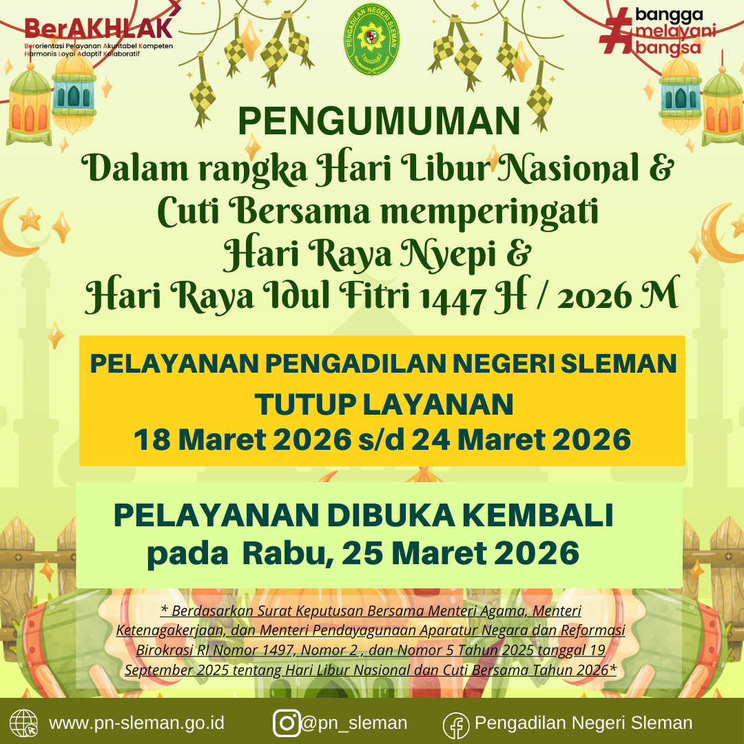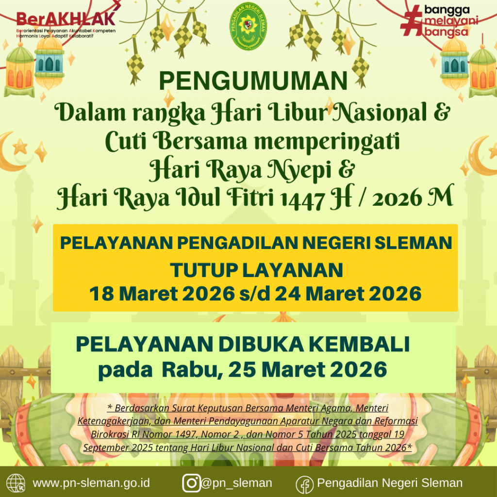 Pelayanan Pengadilan Negeri Sleman Tutup Layanan Pada tanggal 18 Maret 2026 s/d 24 Maret 2026, Pelayanan dibuka Kembali Pada Rabu, 25 Maret 2026.